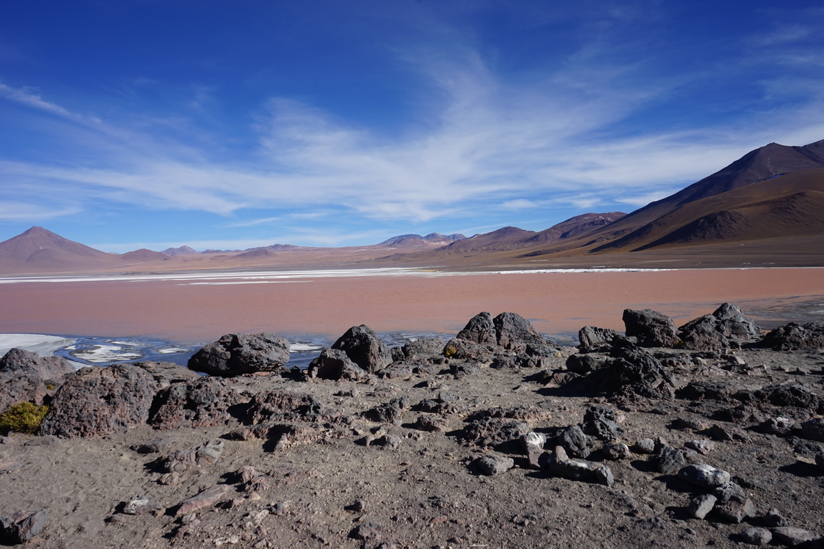 Milli Park içinde yolumuza devam ederken bir sonraki durağımız suyunun rengi nedeniyle Kızıl Göl olarak da anılan Laguna Colorada. Dünyanın en ender rastlanan flamingo türü olan James flamingolarının yaşam alanı olan gölün suyu, rengini içindeki bazalt minerali ve alglerden alıyormuş.