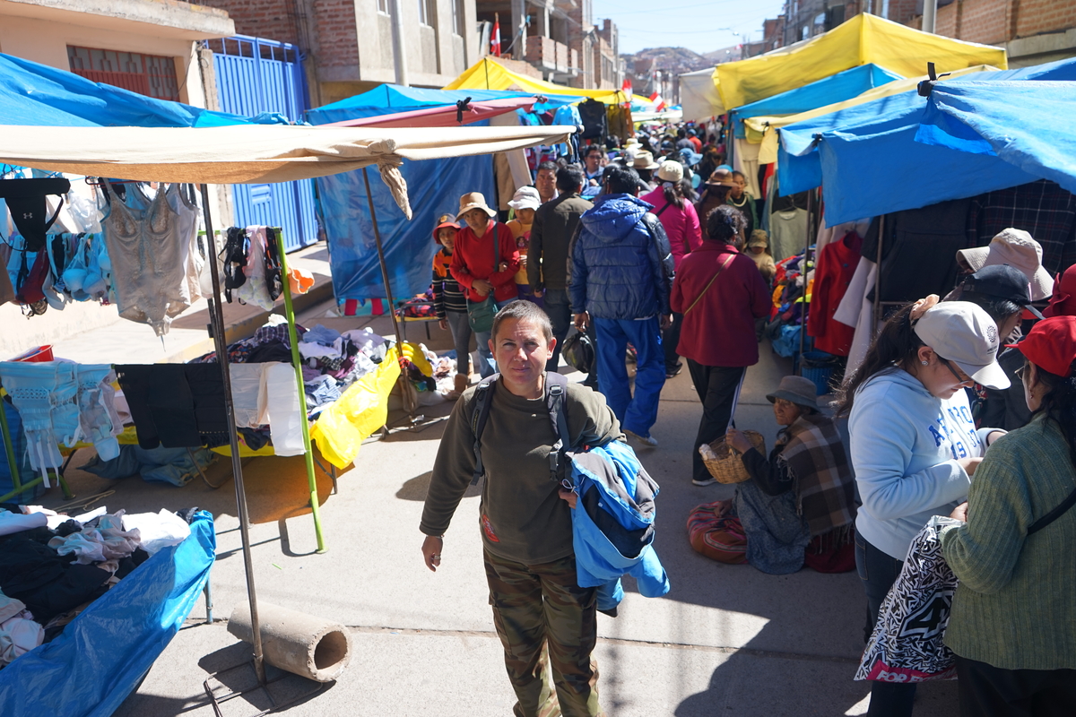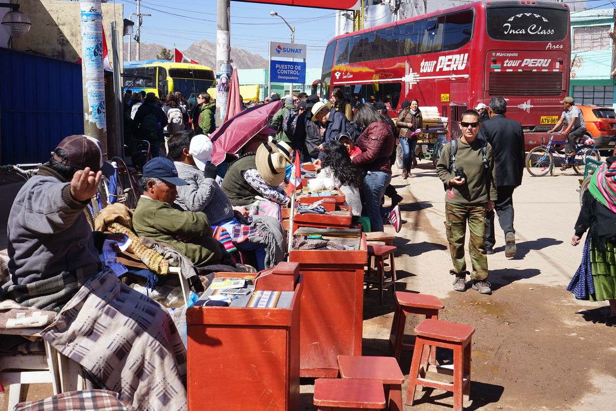 Ortalıkta bir kargaşa ki anlatmaya ne kelime yeter, ne benzetme. Bolivia sınırında eşyalarınızı otobüste bırakarak iniyor, ülkeden çıkışınızı onaylattıktan sonra satıcılarla dolu köprüyü yürüyerek Peru gümrük kapısından ülkeye girişinizi onaylatıyorsunuz. Ve tüm yolcular bu işi tamamladıktan sonra otobüs sizi Peru tarafından alıyor. Girenler, çıkanlar, çığırtkan satıcılar ve işporta kambiyocular. Peru’ya geçiş yaptığınız noktada yan yana dizilmiş seyyar döviz tezgahları anında para dönüşümü konusunda yardımınıza koşuyor. Tabii güvenirseniz. Hoş, insan zora düştü mü sokak köşesindekinden bile yapıyor!
