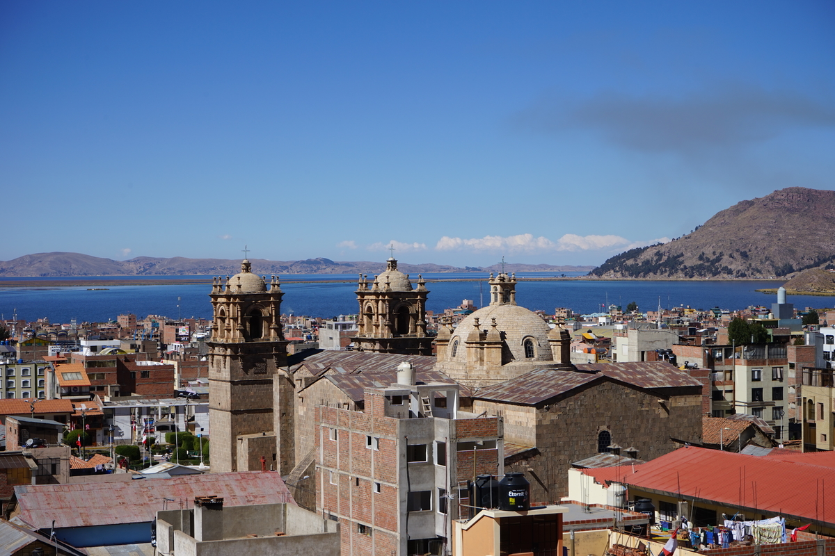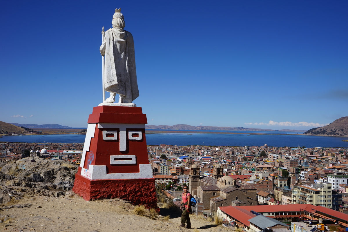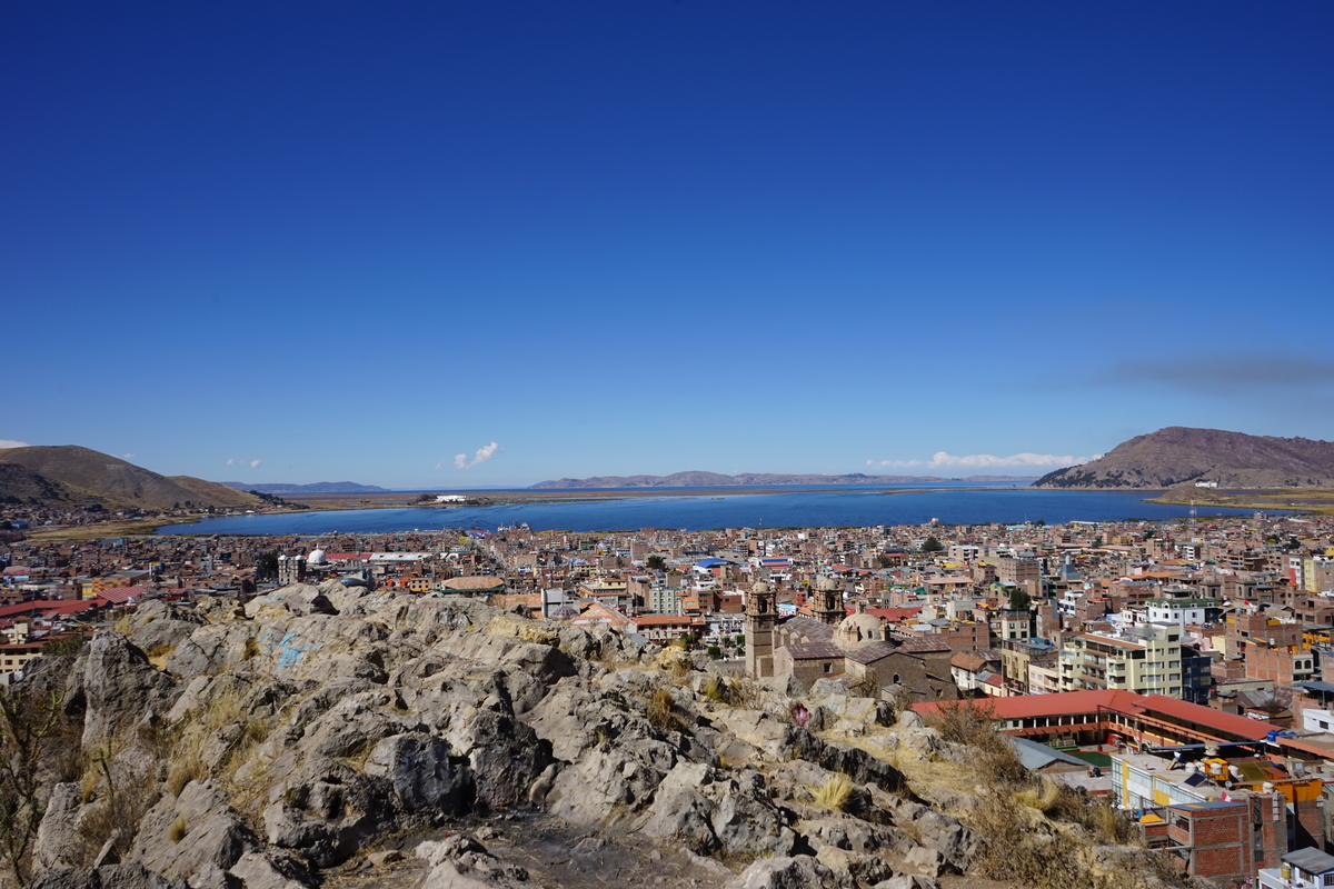 Tüm şehir ve Titicaca Gölü ayaklarımızın altında. Manzara nefes kesiyor diyeceğim ama bizimkisi zaten çıkarken kesildi. O sabah nefesimizden dumanlar çıkaran hava da tişörtle gezecek kıvama geldiğinden bir de kazak, mont yükü çıktı başımıza.