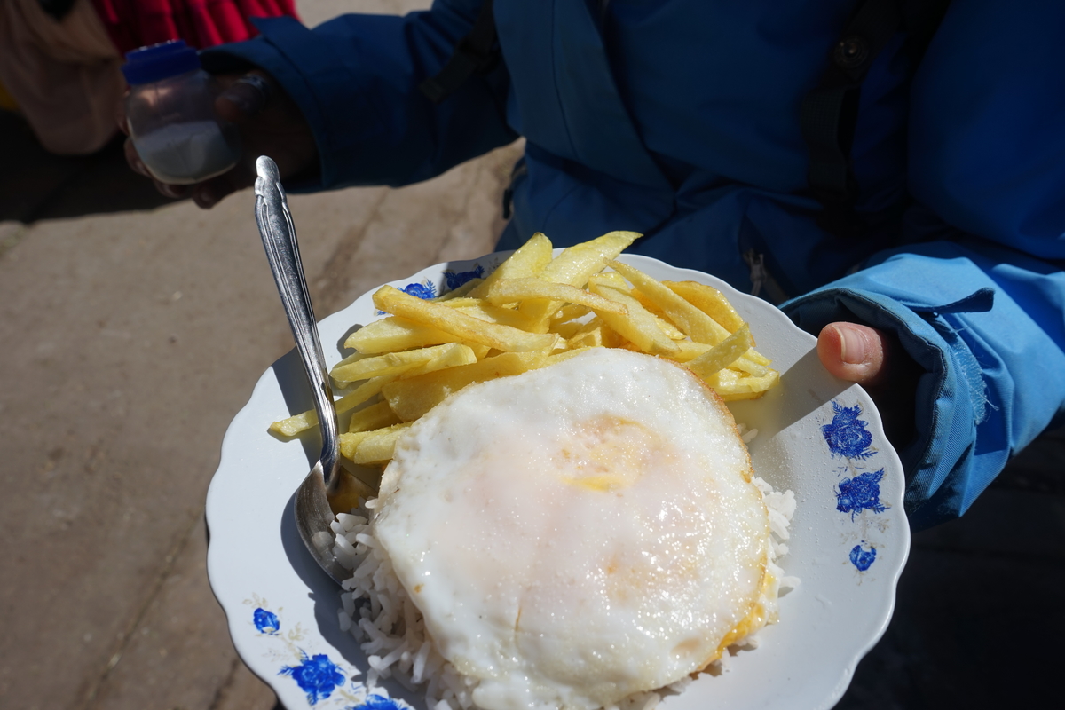 Pirinç, kızarmış patates ve sahanda yumurtadan oluşan kahvaltı menümüz. Daha hostelden çıkar çıkmaz kalabalığı takip edip bir bit pazarının içinde buluveriyoruz kendimizi. Ve elbette türlü türlü yemek tezgahları. Biz de bunu bulur bulmaz oturuveriyoruz ablanın tezgahına, hemen önümüzde kırıveriyor yumurtayı, tüpünün üstündeki kararmış tavasına. Afiyetle yiyoruz hazırladıklarını. Ödediğimiz bedel ise sudan ucuz.